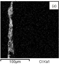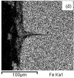 元素的面掃描分析結果如圖4所示,由結果可見:裂紋中富集氧元素;緊靠基體表面主要含鉻、鐵的氧化物,相對較均勻;外面一層富集氯、鉀元素;好表面存在分布不連續的含鉻、鐵氧化物(見圖4)。