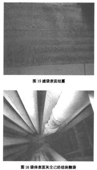 由于“四管爆裂”現(xiàn)象,導(dǎo)致水分進(jìn)入除塵器,造成濾袋表面結(jié)露、糊袋現(xiàn)象。