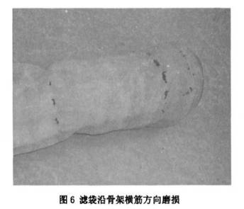 濾袋和骨架接觸部分長(zhǎng)期由于脈沖噴吹導(dǎo)致接觸部分磨損,表現(xiàn)為很明顯的橫豎筋條方向磨損 痕跡。要注意濾袋和骨架的尺寸配合、骨架表面的光潔度等。
