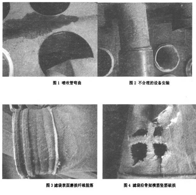濾袋袋口部位破損多在袋口向下30-40公分以內(nèi),多表現(xiàn)為濾料底層吹破、脫落。多為壓縮空 氣過(guò)高、噴吹管歪斜、花板變形等原因造成,在安裝過(guò)程中要注意安裝的質(zhì)量。