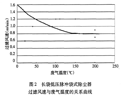經(jīng)分析,袋式除塵器過濾風(fēng)速(也稱氣布比)一般與被處理的廢氣的溫度、含塵濃度和塵的粒徑密切相關(guān),即
