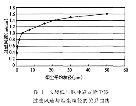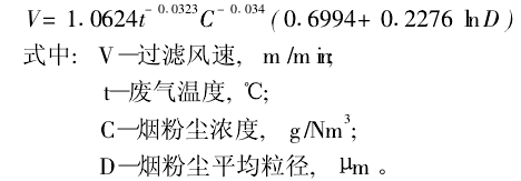 由此可見,脈沖清灰袋式除塵器過濾風(fēng)速與廢氣溫度和廢氣中的煙粉塵濃度成反比,與煙粉塵粒徑的對(duì)數(shù)成正比。