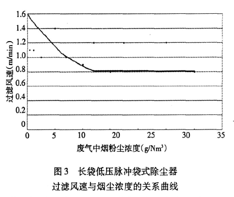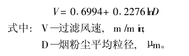 該式雖是通過曲線擬合得到的,但我們在2005年后設(shè)計(jì)脈沖除塵器時(shí),其過濾風(fēng)速的選取均是采用該模式計(jì)算,每臺(tái)除塵器的除塵效果都達(dá)到了要求(除塵效率達(dá)到99.9%或排放口濃度小于30g/Nm3)。