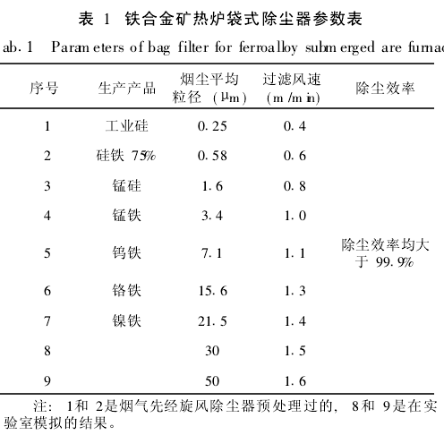 這里選取了用在鐵合金礦熱爐煙氣除塵的19臺(tái)除塵器,鐵合金礦熱爐煙塵由于煙塵粒徑細(xì)、煙氣溫度高,治理難度極大,不論機(jī)械式除塵器、濕式除塵器,還是靜電除塵器,均不能達(dá)標(biāo),只有采用布袋除塵器,且布袋除塵器中又只能選取脈沖清灰和逆氣流反吹清灰才行,因此19臺(tái)除塵器均采用長袋低壓脈沖袋式除塵器,所有礦熱爐煙氣在進(jìn)入除塵器前,經(jīng)冷卻將溫度降低至200℃左右,廢氣中煙塵濃度在進(jìn)入除塵器前均在1.2~2.0g/Nm3之間,這樣就基本排除了煙塵濃度和煙氣濃度對(duì)過濾風(fēng)速的影響。具體參數(shù)見表1。
